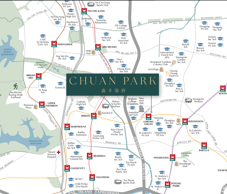 Chuan Park is within 1 kilometer to 5 primary schools, including the popular St Gabriel’s and Yangzheng primary school. Within a short drive, residents can reach Junction 8 and NEX, malls that offer a variety of restaurants, supermarkets and shops.